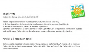 Op 19 november 2012 zijn de statuten ondertekend bij het notariskantoor Veldhuizen Beens van de Castel. De oprichting van energie coƶperatie Zon@School (statutair Zon op School) is daarmee realiteit. Het statuut voorziet in de mogelijkheid dat Zon@School als paraplu fungeert voor meerdere scholen die met behulp van crowdfunding de plaatsing van zonnepanelen mogelijk willen maken.